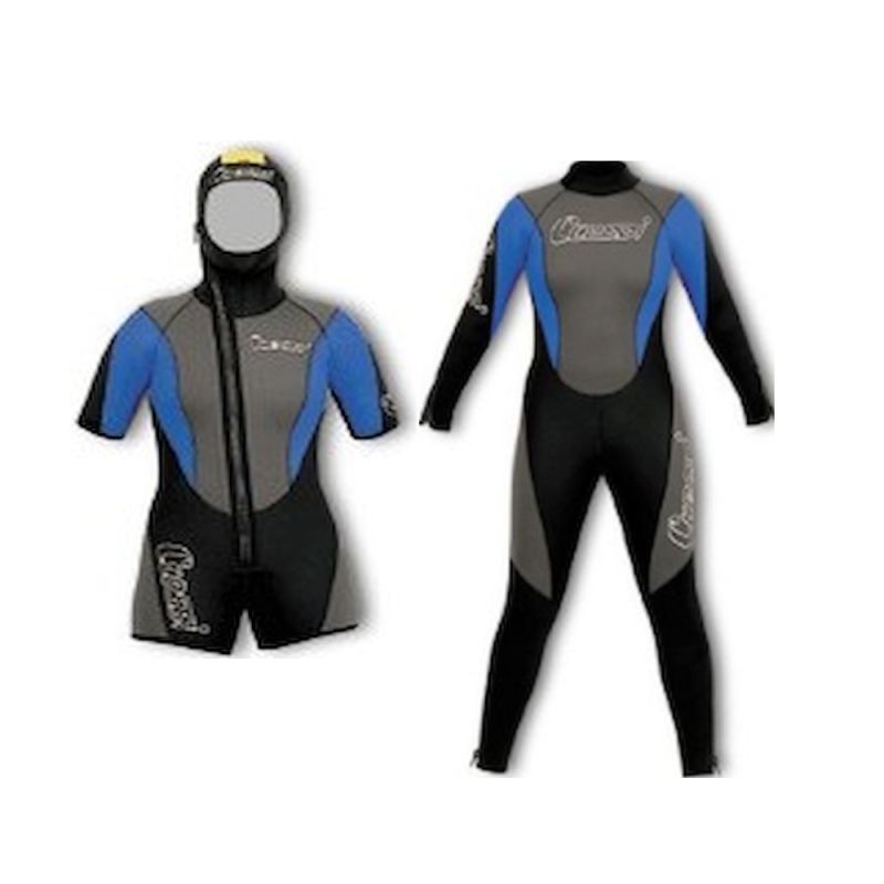Giacca con cappuccio incorporato, pantaloncino e manica corta; monopezzo con cappuccio separato. Tutto in neoprene bifoderato disponibile in spessore 5 mm o 6,5 mm. Colore nero con inserti grigi e azzurri.