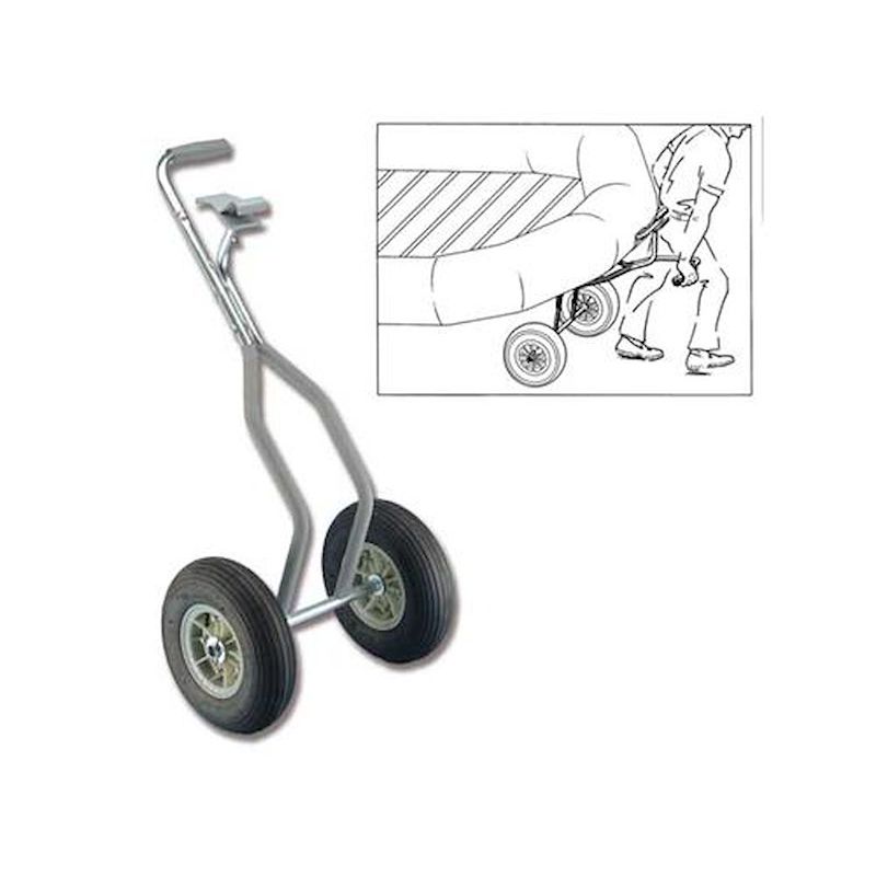 Carrello anteriore per trasporto gommoni pneumatici . Si fissa al maniglione anteriore dei canotti pneumatici. Grazie al movimento autosterzante, consente un facile alaggio anche su terreni impervi o sabbiosi. Smontabile per un facile trasporto.
