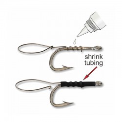 L’anello viene avvitato direttamente all’ amo, bloccato definitivamente con una goccia di colla Ciano-acrilica e protetto con guaina termoretraibile inclusa nel prodotto.