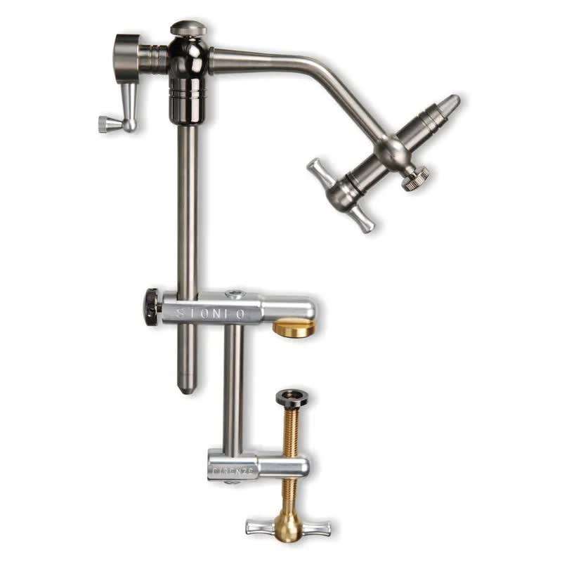 Morsetto rotante in asse a 360° di alta qualità per la costruzione di mosche ed esche artificiali con albero porta testa in acciaio inox supportato da due cuscinetti a sfera di precisione. Frizione regolabile sul movimento di rotazione. Bloccaggio testa 0°. Leggero e poco ingombrante.