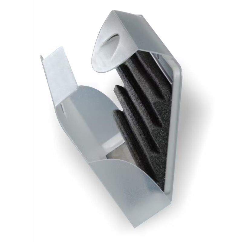 Placchetta appendi mosche in gomma ondulata espansa ad alta densità con copertura di protezione trasparente in polipropilene. Il fondo di questa struttura scatolare è magnetico e chiuso ai lati per evitare la perdita di mosche. Di pratico utilizzo si fissa al gilet per mezzo di una spilla di sicurezza. Dim. mm 85X60.