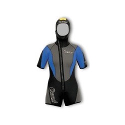 Giacca con cappuccio incorporato, pantaloncino e manica corta in neoprene bifoderato da 3,5 mm; monopezzo in neoprene bifoderato da 5 mm con cappuccio separato. Guarnizioni ai polsi e alle caviglie del monopezzo per un perfetta tenuta stagna. Colore nero con inserti avio e gialli. GIACCA CON GUARNIZIONE STAGNA AL FACCIALE E CHIUSURA CON CERNIERA AL MENTO CAPPUCCIO CON GUARNIZIONI