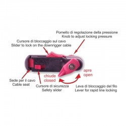 Pinza di sgancio della lenza per la pesca a traina con affondatore. Dotata di pomello di regolazione della pressione di serraggio del filo e di un esclusivo dispositivo a levetta per l'aggancio-sgancio rapido della lenza che permette di aprire o chiudere la pinza senza dover regolare nuovamente la pressione di serraggio. Brevettato. Indicato per: Traina e...