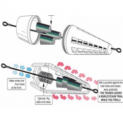 L'acqua che entra dai fori nella parte anteriore si rompe lentamente e rilascia l'esca attraverso i fori ai lati del teaser.
